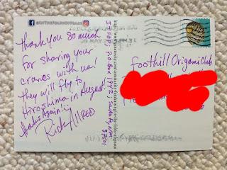 To receive a million cranes from thousands of people and organizations from around world–and then escort a million cranes on a journey halfway across the globe–must require, in the project’s Indiegogo page’s words, a “logistical miracle.” Yet, while creating this logistical miracle, Allred found time to personally hand-write a postcard to our club at FHS. This was very touching, especially because he probably wrote back to the thousands of other contributors who folded cranes as well.